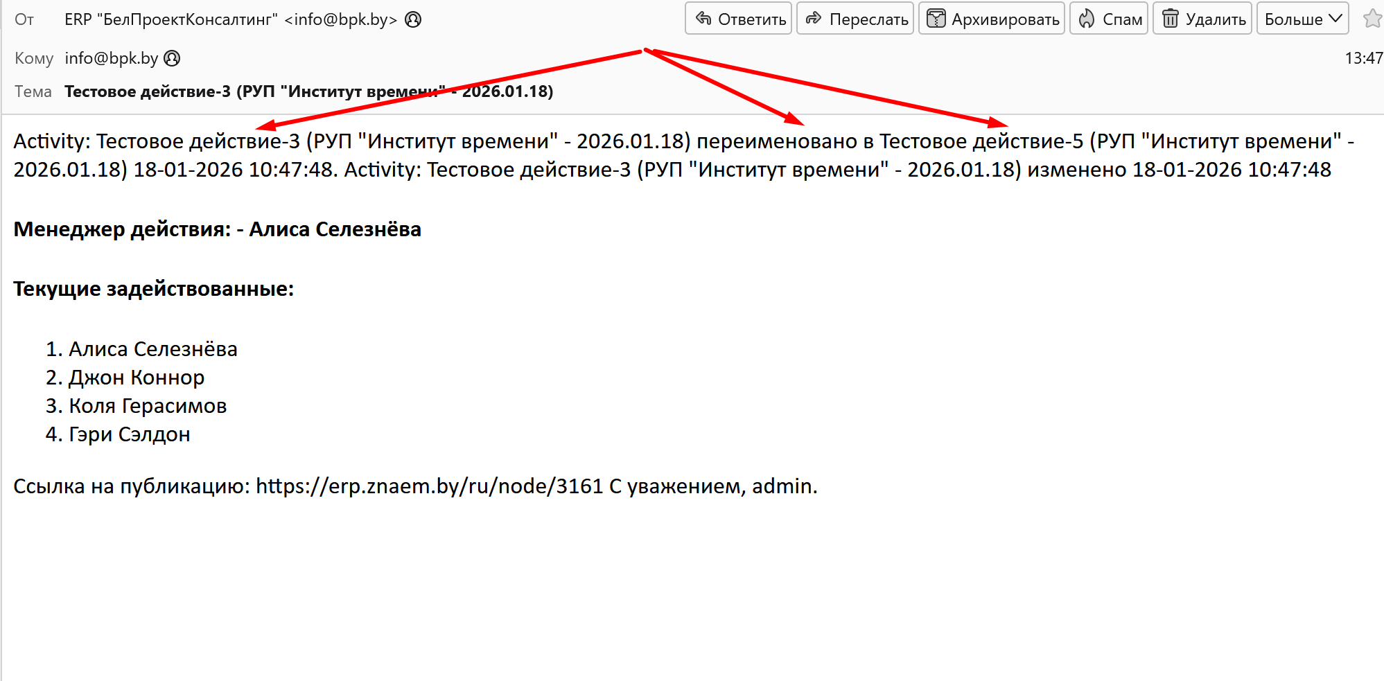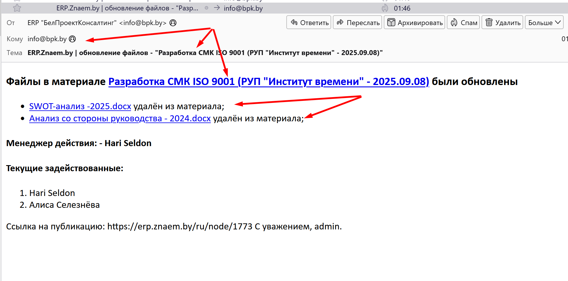ERP.Znaem.by предоставляет систему email-уведомлений для повышения командной информированности в действиях, задачах, проектах и других типах контента. Уведомления автоматически отправляются всем задействованным пользователям при ключевых изменениях, исключая необходимость ручной пересылки информации. Функционал охватывает добавление/удаление файлов, обновления материалов, добавление и удаление комментариев.