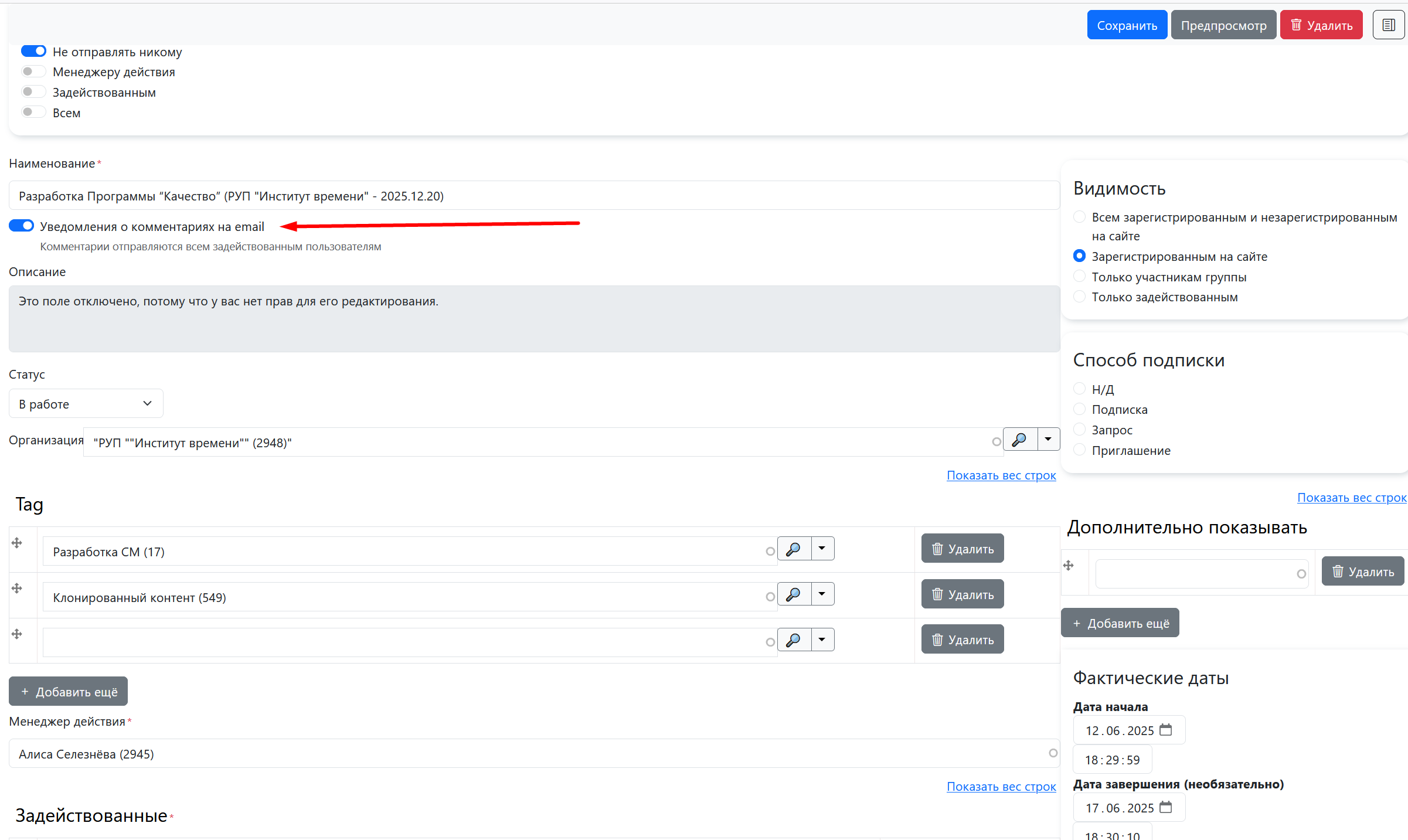 При создании, редактировании действия или любого другого типа контента для пользователей доступна настройка отправления уведомлений на  Email. Для этого на странице редактирования контента необходимо выбрать необходимую из доступных настроек: